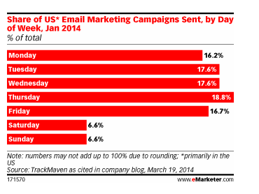 Experian Marketing Services saw that Saturdays garnered the highest open, click and purchase rates from email campaigns. Perhaps people are just too busy during the week and like to engage with their emails on the weekends. We sure do.