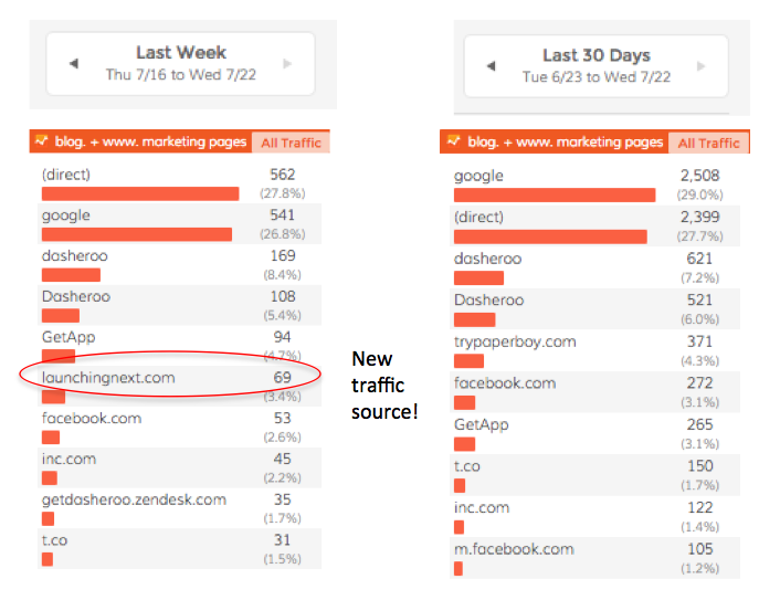 If we see that there might be something going on with traffic, like maybe we got a new traffic source (or lost an existing one) we compare date ranges on the All Traffic insight. We select a date range or “Last Week” vs. a “30-Day” range and compare where traffic is coming from. In this one you’ll see we got a new source of traffic because LaunchingNext linked to us and included us in an email. Awesome!