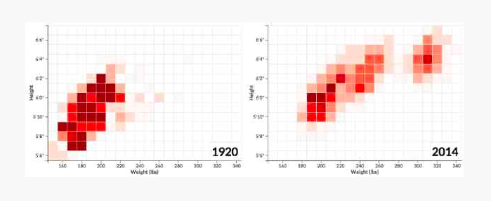 Data Visualization: How Big NFL Players Have Gotten Over The Years June 26, 2014 by John Hingley·0 Comment Thanks for this graph Flowingdata. Share this: