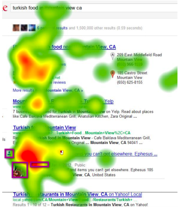 The red areas are where more people focused on, the the purple boxes are what people clicked on! So, this was only one study but it appears Google Authorship and social annotations may in fact effect CTRs. There’s nothing we can do about it, but keep an eye out on your organic traffic dashboard as we see these changes already taking place.