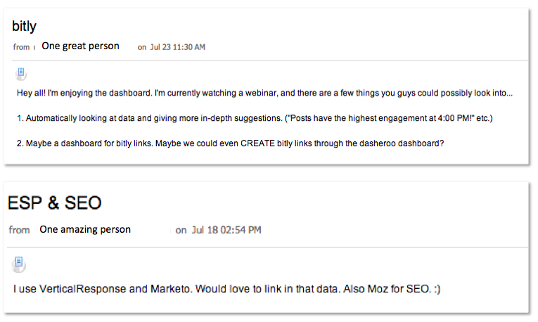 - You want more applications to connect to like Twitter, VerticalResponse, Moz and Marketo. (Twitter is in the works!)